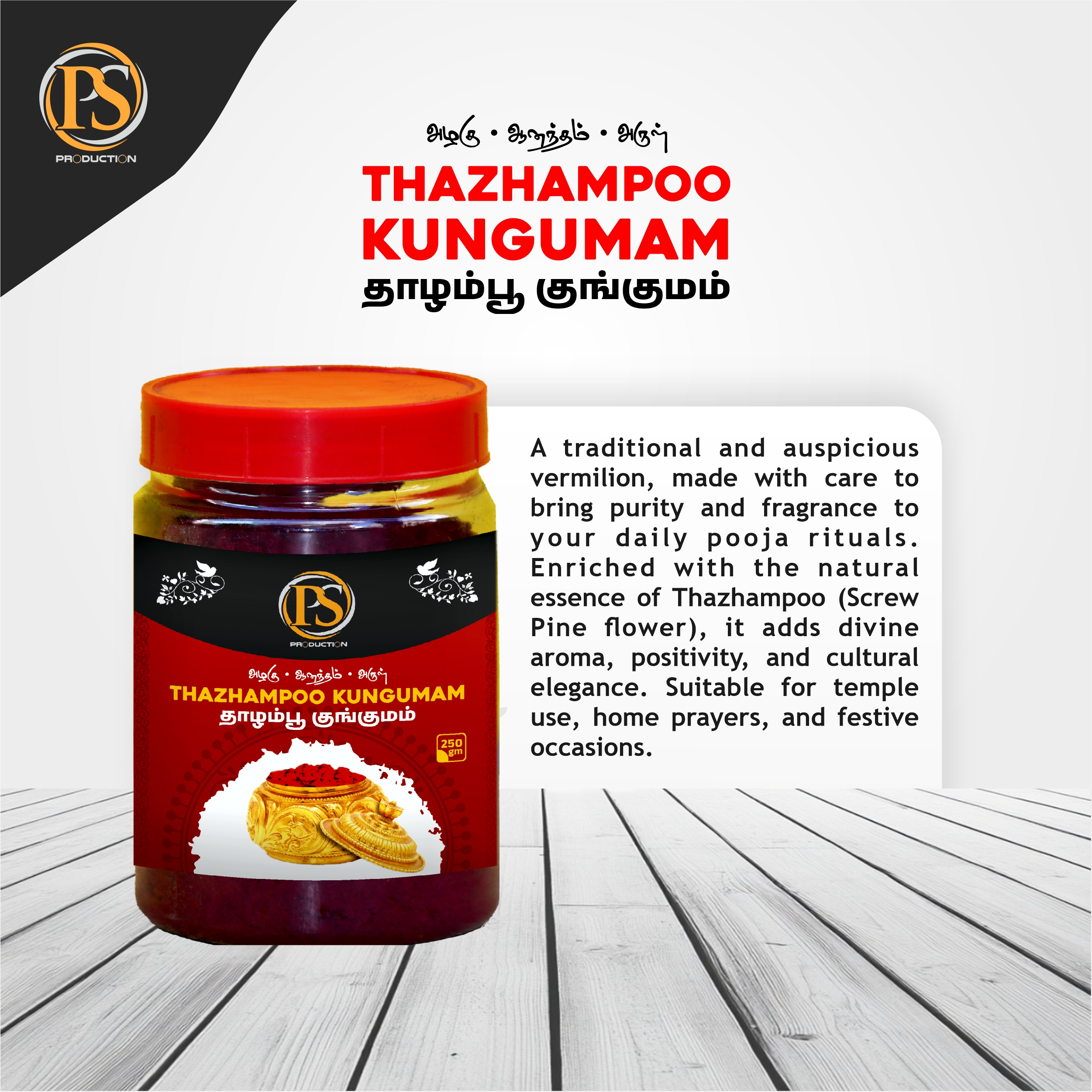 Thazhampoo Kumkumam is a premium-quality vermilion powder made using natural ingredients and infused with the soothing fragrance of Thazhampoo (Screw Pine flower). It is widely used in South Indian traditions for daily worship, temple visits, and festive occasions. The pleasant aroma symbolizes purity, prosperity, and divine blessings.